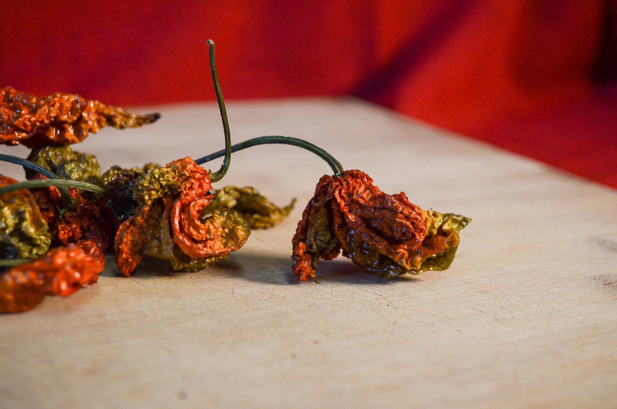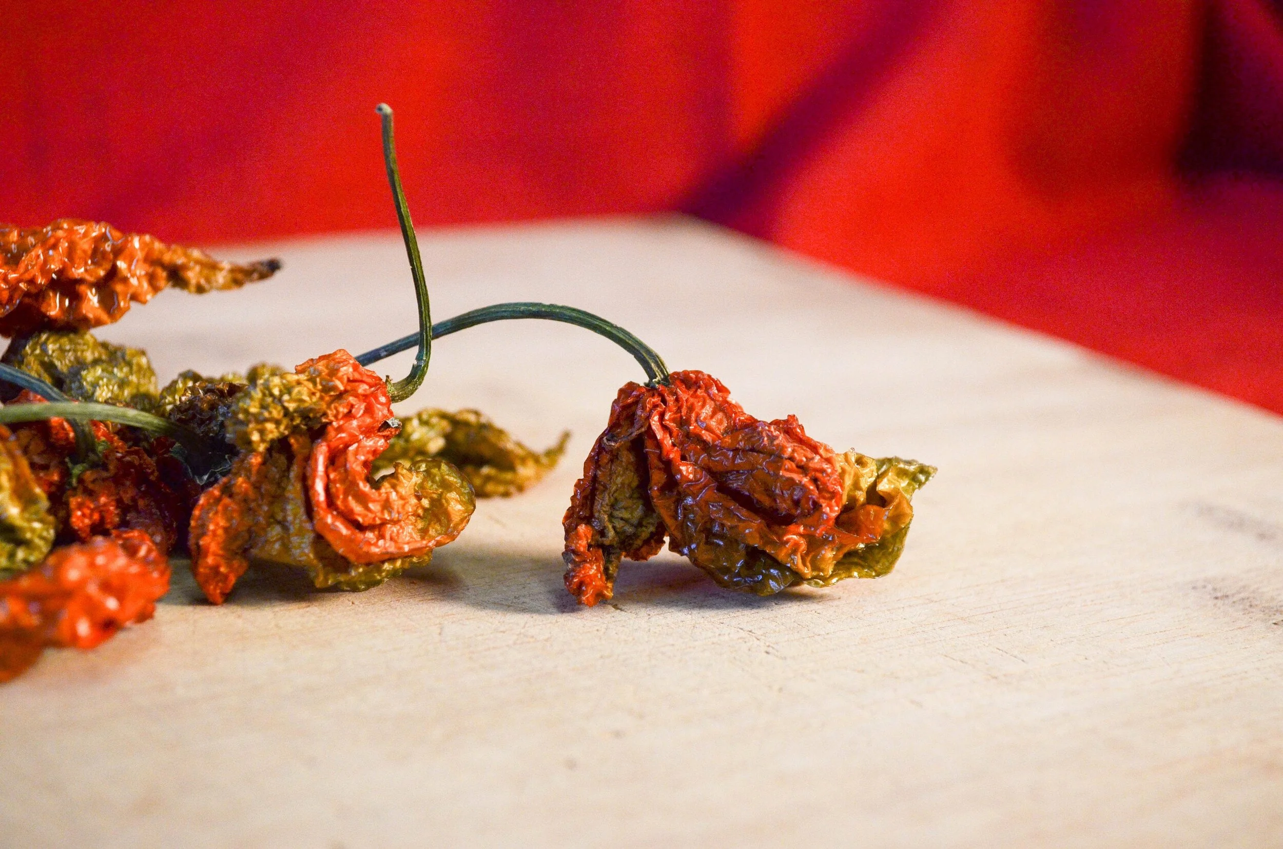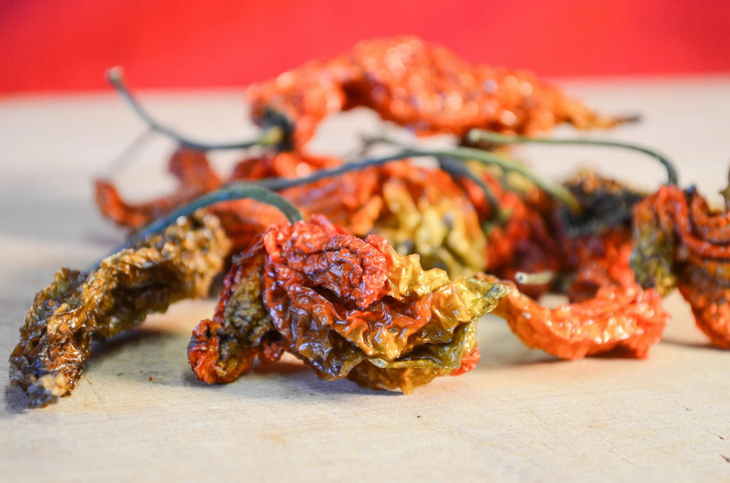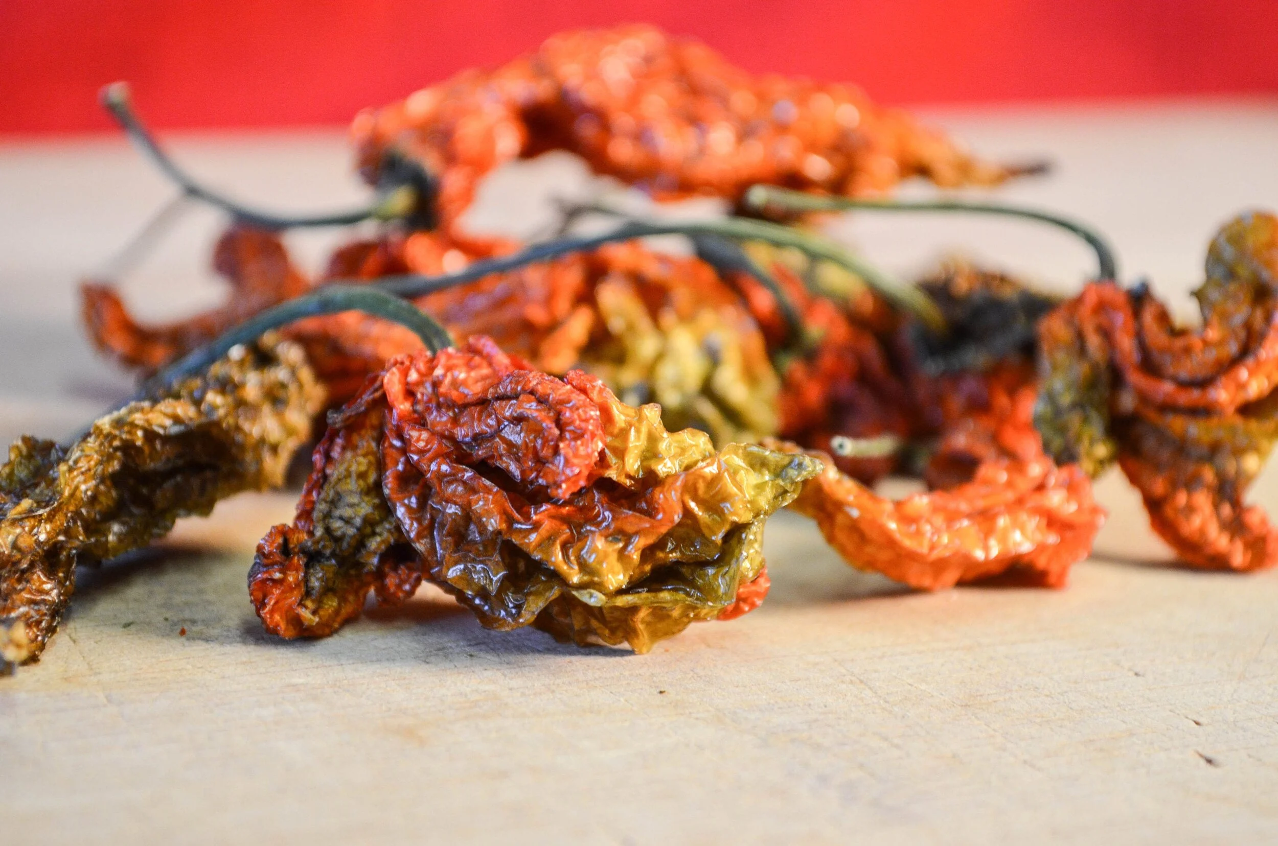 Dried Organic Ghost Peppers (Bhut Jolokia) hand harvested and grown by Purple Sage Farms