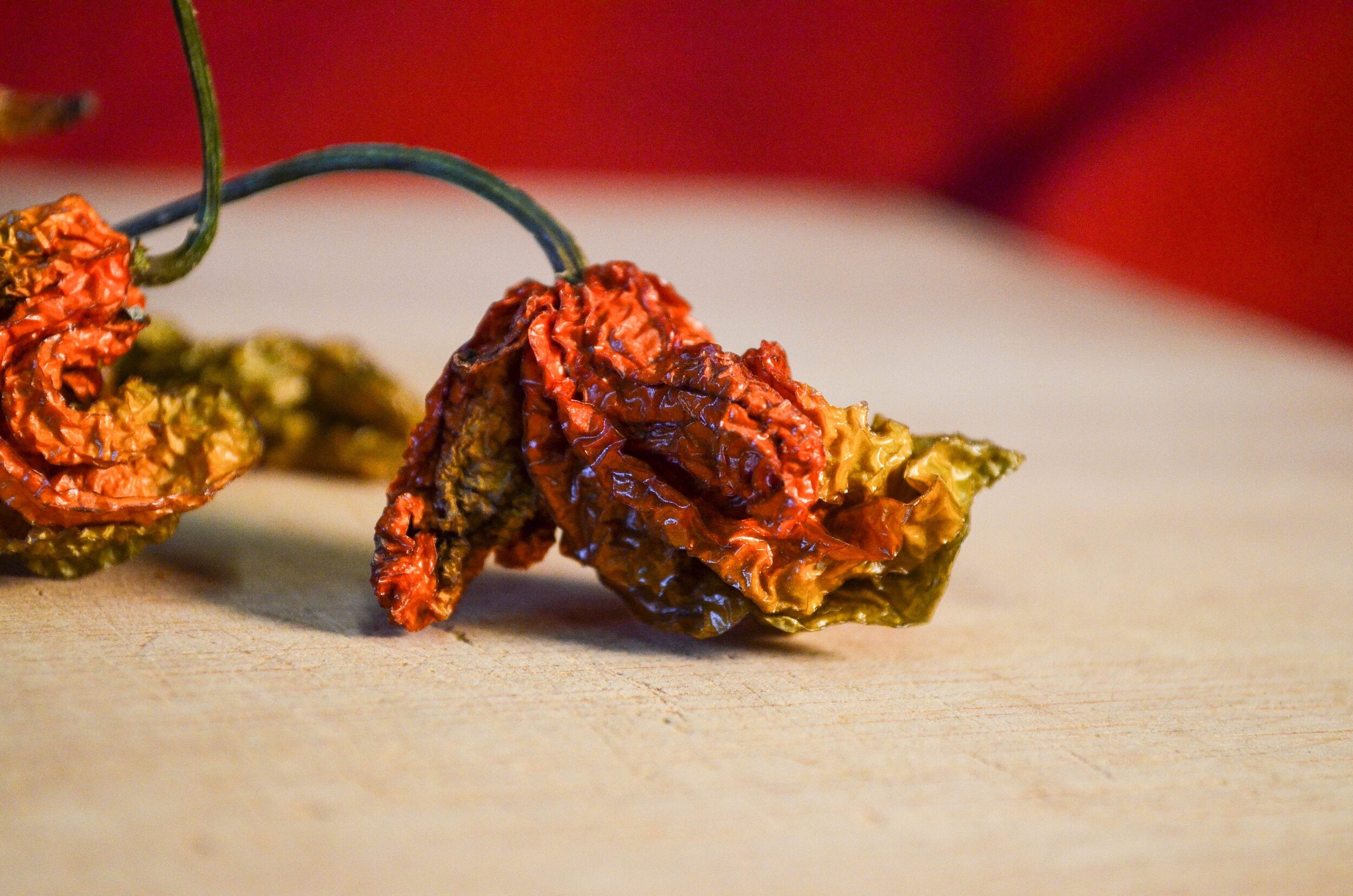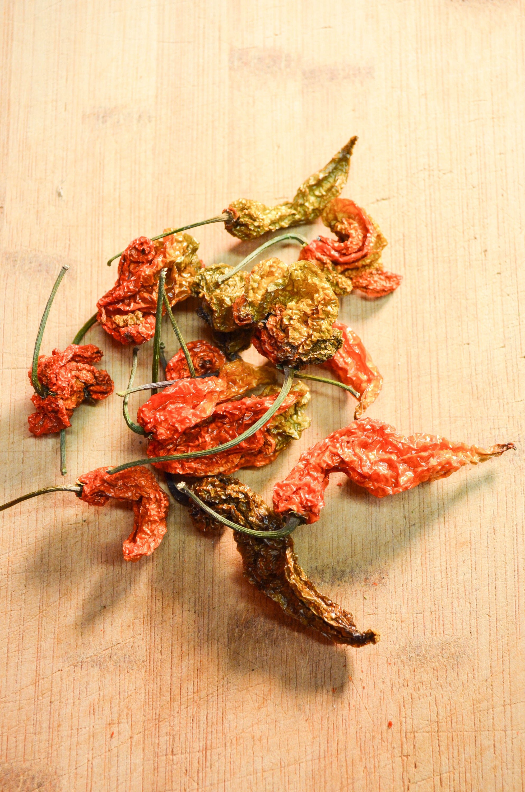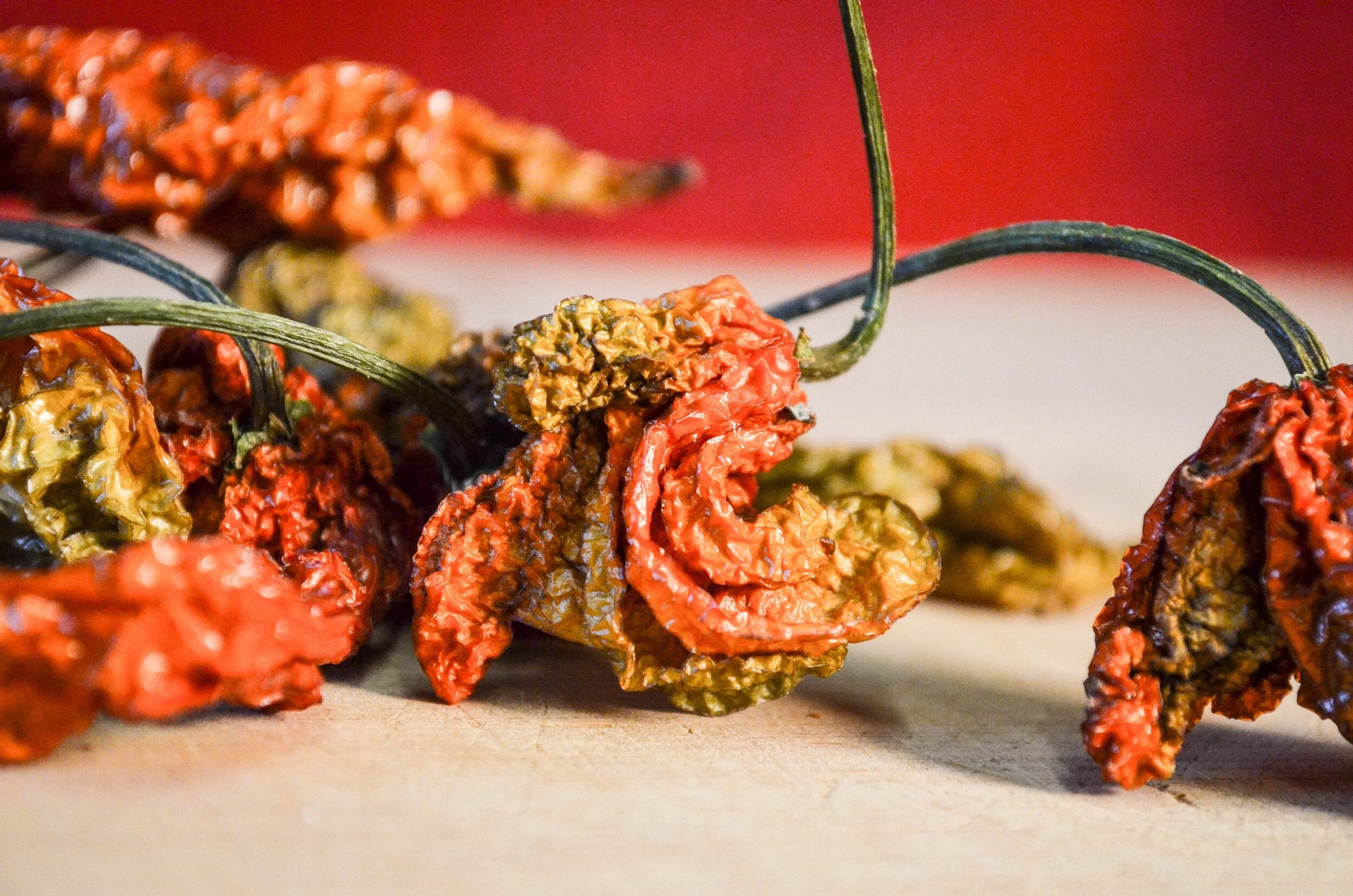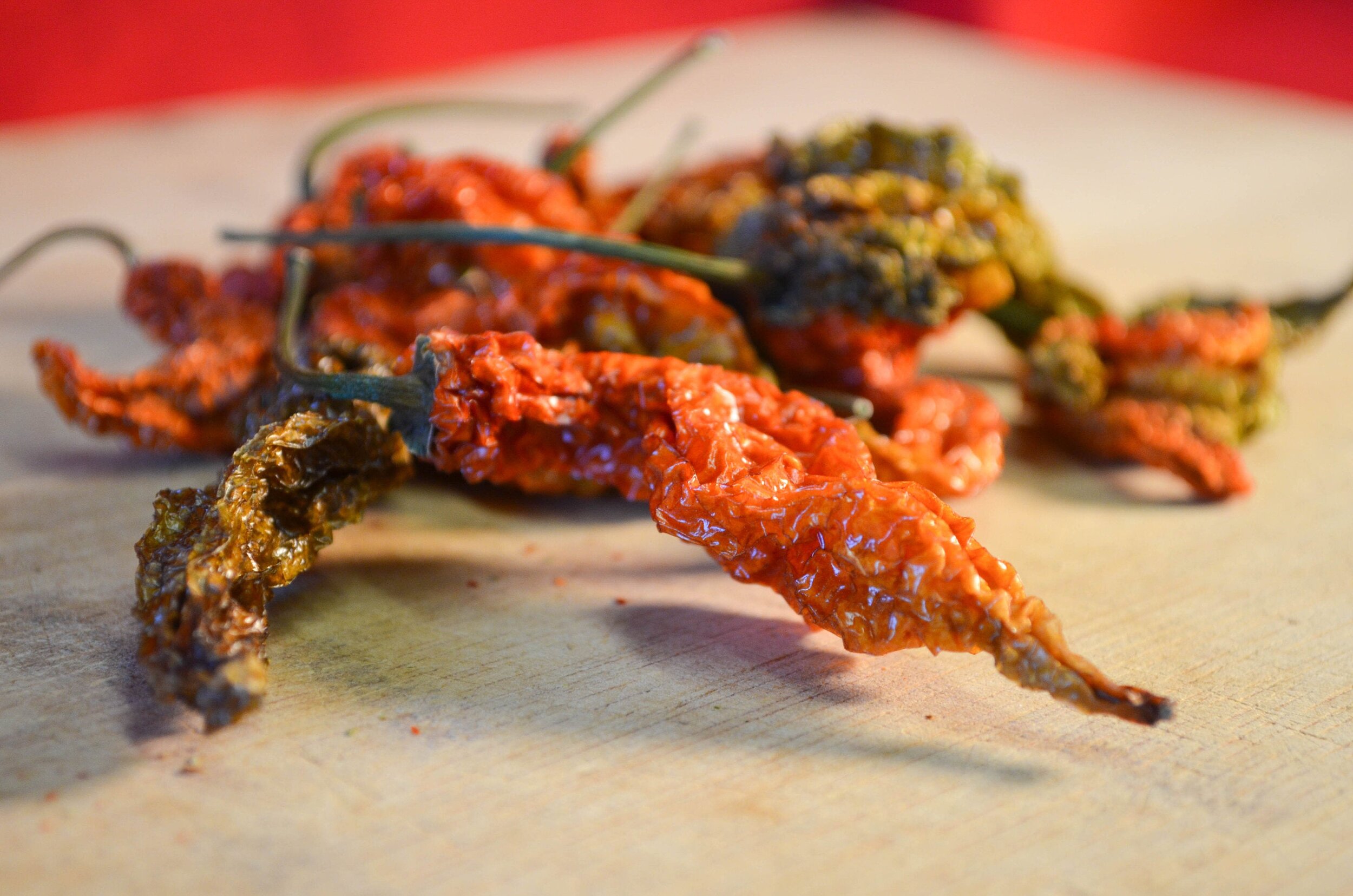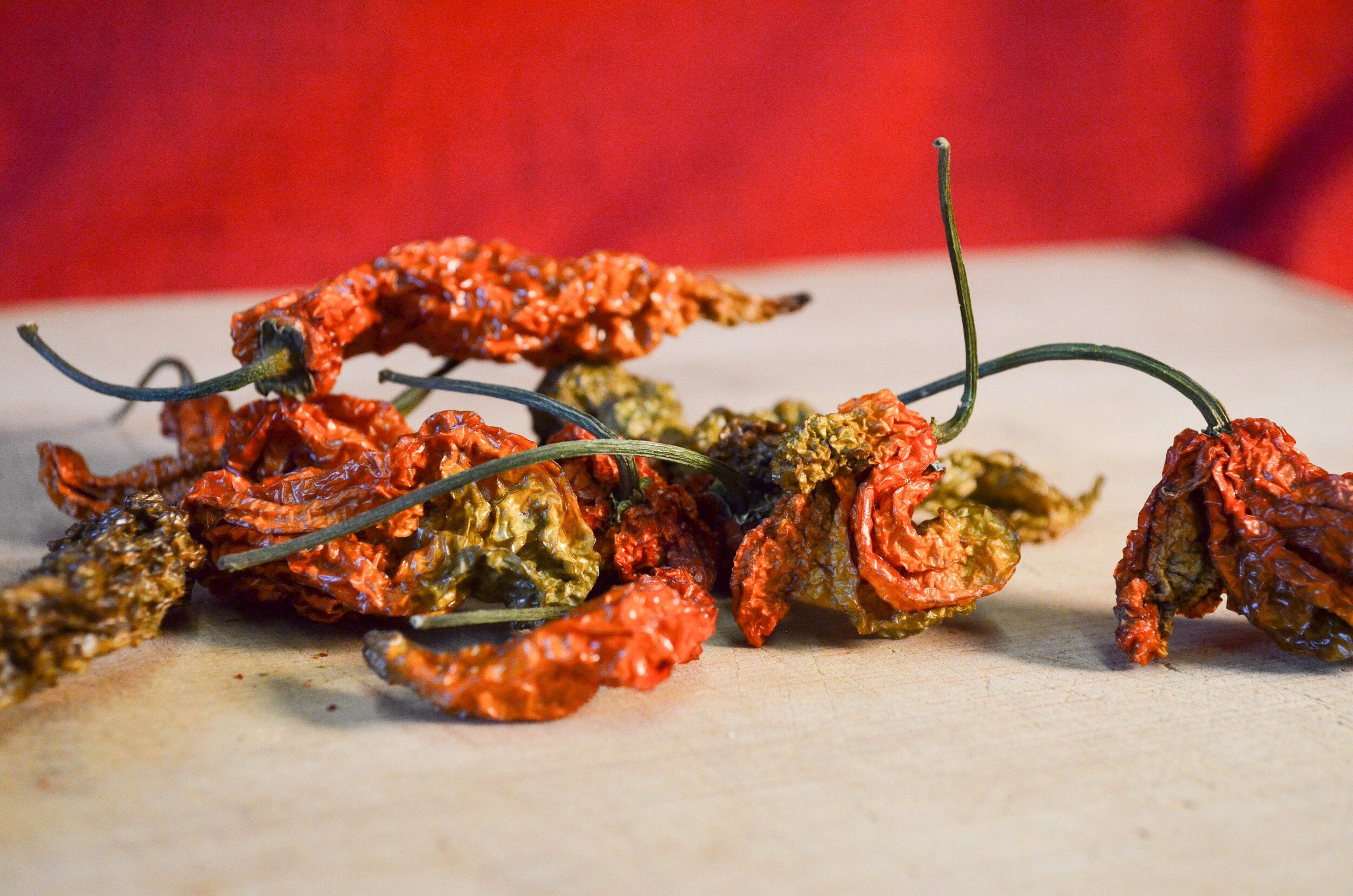 Dried Organic Ghost Peppers (Bhut Jolokia) hand harvested and grown by Purple Sage Farms