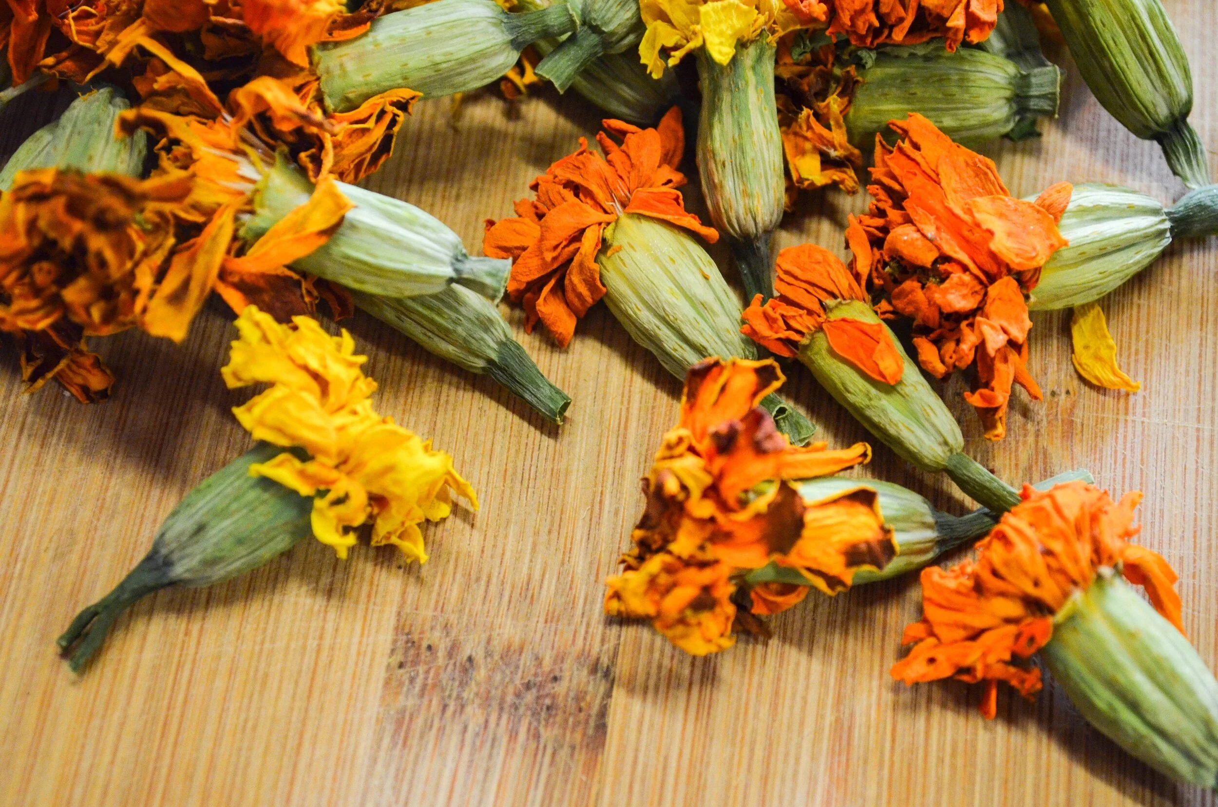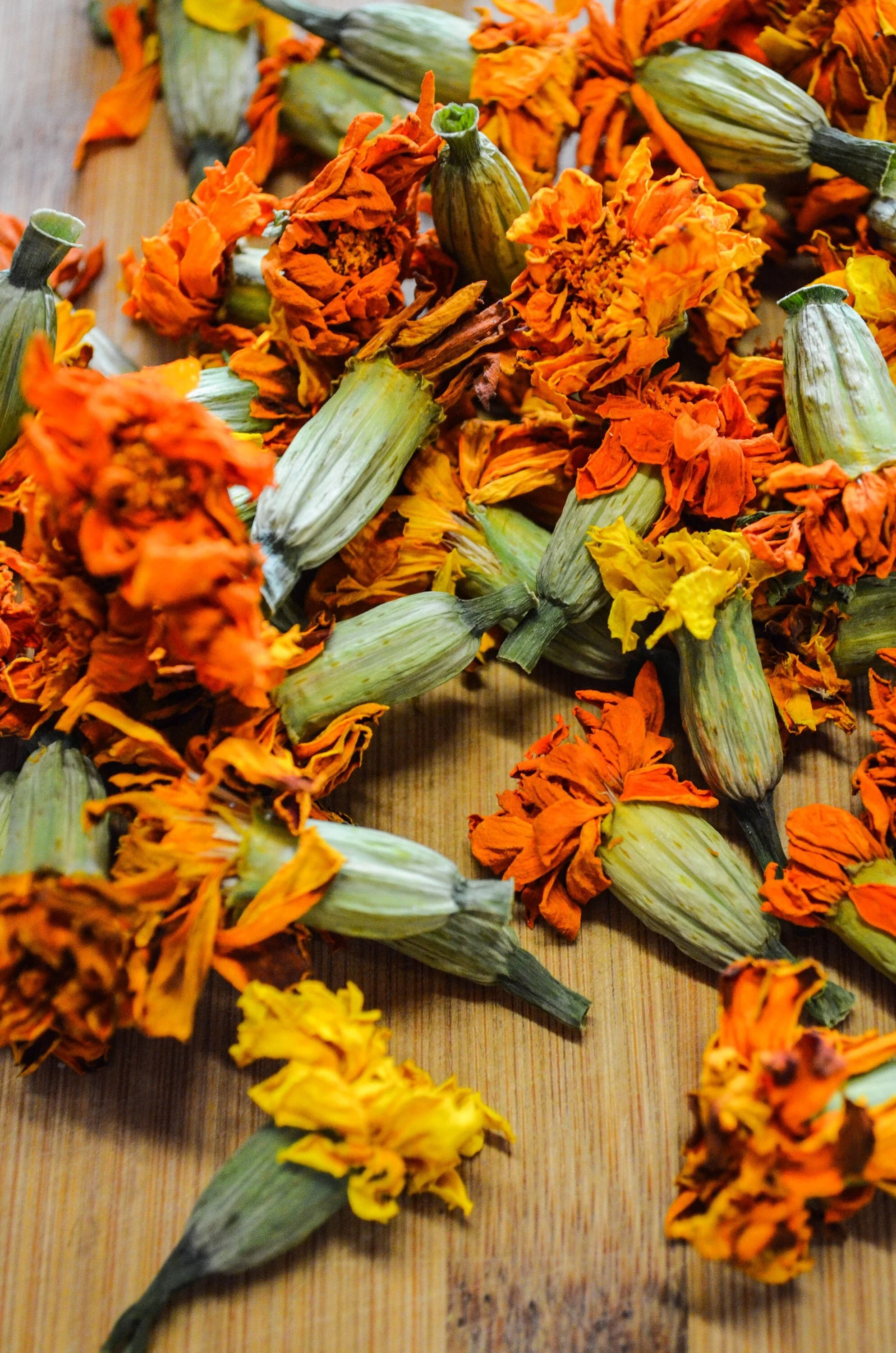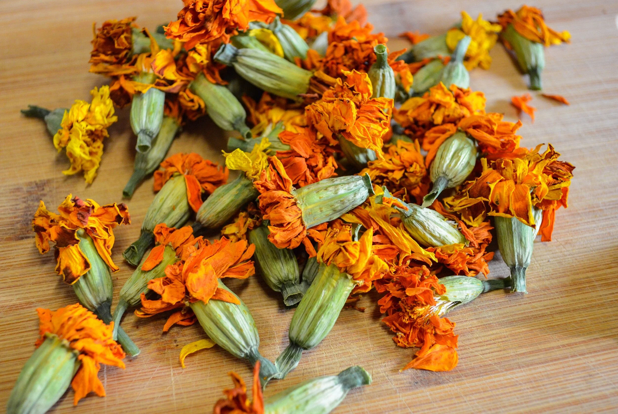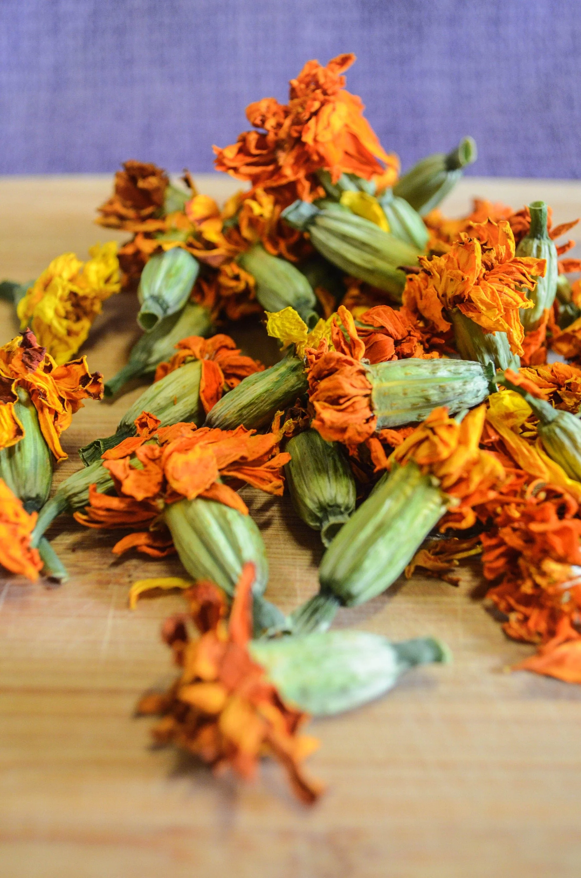 Dried Organic Marigold Flowers (Tagetes patula) hand harvested and grown by Purple Sage Farms